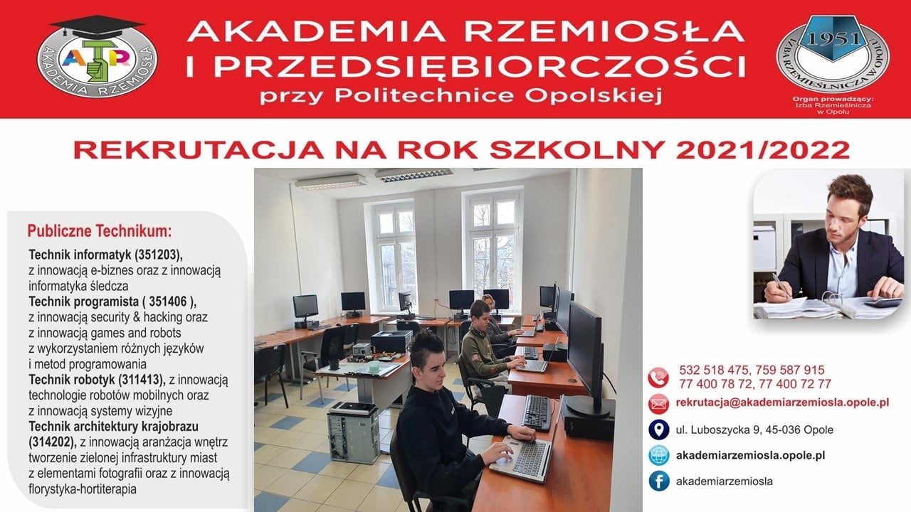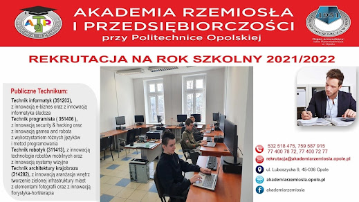 W Publicznym Technikum w Opolu- Akademia Rzemiosła i Przedsiębiorczości przy Politechnice Opolskiej na rok szkolny 2021/2022 prowadzimy nabór do klas pierwszych