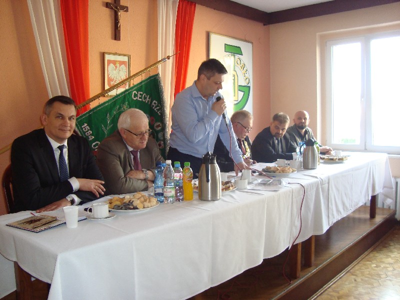 Uroczystego otwarcia Walnego Zgromadzenia dokonał pan Alojzy Bardorz – Starszy Cechu, witając serdecznie przybyłych na zebranie rzemieślników i zaproszonych gości.  Zgromadzenie rozpoczęło się od uczczenia zmarłych członków Cechu minutą ciszy.  Przewodniczącym zebrania został wybrany Grzegorz Pakuła,  sekretarzem – Hubert Brodacki . Uroczystość uświetnili swoją obecnością  goście:  Prezes Izby Rzemieślniczej w Opolu Pan Tadeusz Staruch, poseł z ramienia PO – Tomasz Kostuś, Starosta – Roland Fabianek ,  wi-ce  prezes Izby Rzemieślniczej w Opolu  pan Artur Kniejski, Horst Chwałek – dyr. Zespołu Szkół Zawodowych w Oleśnie,  Rataj Joachim- kierownik szkolenia praktycznego  Zespołu Szkół Zawodowych w Oleśnie,  Maciej Flank – dyr. Powiatowego Urzędu Pracy w Oleśnie, Grzegorz Polak – przedstawiciel  Burmistrza Olesna . Szczególnie serdecznie Starszy Cechu przywitał  Honorowych członków Cechu  Pana Błażeja Wolnego  . W zebraniu uczestniczyło 49 rzemieślników. To kolejny rok z bardzo dobrą frekwencją.  Rzemieślnicy  interesują się sprawami działalności gospodarczej. Cieszy fakt, że w zebraniu brała udział liczna grupa młodych rzemieślników. Jednym z ważniejszych punktów obrad było sprawozdanie z działalności Zarządu i Biura Cechu za 2018r i udzielenie absolutorium ,,Starszemu’’ i  Zarządowi . Sprawozdanie przedstawił w  formie prezentacji multimedialnej -kierownik Biura  Cechu Paweł Miozga . W końcowej mowie Starszy  Cechu podkreślił, ze obecnie  Cech zrzesza 146 członków i posiada dobrą sytuację finansową mimo braku  części najemców.  Podziękował gościom zaproszonym za współpracę była ona bardzo dobra  na poziomie Powiatu, Szkoły i Urzędu Pracy. Szczególne podziękowania skierował pod adresem pracowników Biura Cechu, którzy na co dzień dbają o sprawy rzemieślników. Miłe słowa  uznania i podziękowania skierował do rzemieślników, którzy aktywnie uczestniczyli w działalności Cechu. Zawsze można było liczyć na pomoc. Bardzo serdecznie podziękował wszystkim rzemieślnikom , którzy swą solidną pracą i postawą kreują wizerunek naszego Cechu.