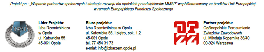 W związku z realizacją projektu współfinansowanego ze środków Unii Europejskiej w ramach Europejskiego Funduszu Społecznego pn.: „Wsparcie partnerów społecznych i strategie rozwoju dla opolskich przedsiębiorstw MMSP”, nr projektu POWR.02.02.00-00-0004/16, Działanie 2.2 „Wsparcie na rzecz zarządzania strategicznego przedsiębiorstw oraz budowy przewagi konkurencyjnej na rynku”, typ 1, Program Operacyjny Wiedza Edukacja Rozwój, Izba Rzemieślnicza w Opolu zaprasza do składania ofert na opracowanie w ramach ww. projektu analizy potrzeb rozwojowych, a na tej podstawie strategii rozwojowych dla mikro, małych i średnich przedsiębiorstw z województwa opolskiego. W skład jednej, kompletnej strategii wchodzi: Plan Rozwoju opracowany na podstawie analizy potrzeb rozwojowych MMSP, raport z dostępności usług rozwojowych dla MMSP w regionie oraz raport upowszechniający wiedzę o zdiagnozowanych potrzebach i barierach rozwojowych. Doradca zobowiązany jest też do udzielania pomocy MMSP we wdrożeniu założeń Planu Rozwoju oraz podejmowania działań interwencyjnych w przypadków trudności we wdrażaniu jego założeń. Partnerem projektu jest Ogólnopolskie Porozumienie Związków Zawodowych z siedzibą w Warszawie.