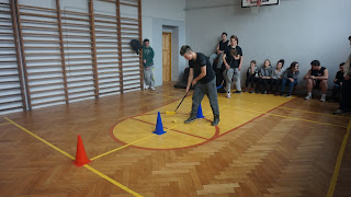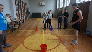 Konkurencja oceniana była na czas i zespołowo. Następnie rzucano woreczkami do celu, wykonywano rzuty zespołowe do kosza w ciągu 1 minuty, strzelano do bramki, po rzutach FRISBEE na celność, zagrano w kręgle w zespołach. Komisja sędziowska skrupulatnie zliczała punkty, wygrała drużyna „żółtych” wynikiem 12- 9.Zwycięzcy w nagrodę obdarowani zostali słodyczami, pokonani na otarcie łez również. Pierwsze spotkanie z wiosną zakończyło się wspólnym grillowaniem.grillowaniem.