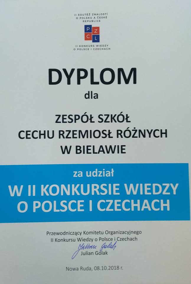 8 października 2018 roku w Centrum Turystyczno-Sportowym w Nowej Rudzie z inicjatywy Juliana Golaka z Sejmiku Województwa Dolnośląskiego i jednocześnie inicjatora Komitetu Organizacyjnego Polsko-Czeskich Dni Kultury Chrześcijańskiej po raz drugi odbył się Konkurs Wiedzy o Polsce i Czechach. W tym międzynarodowym Konkursie Branżową Szkołę I Stopnia w Bielawie godnie reprezentowali – Ryszard Jaworski, Kacper Kumórek, Mateusz Orawiec i Maciej Orawiec. W konkursie łącznie udział wzięło 28 drużyn, w tym 22 z Polski oraz 6 z Czech. W tym miejscu godne podkreślenia jest to, że bielawska placówka rzemieślnicza była jedyną spośród wszystkich uczestników szkołą z Bielawy i w dodatku jedyną szkołą kształcąca w zawodach.