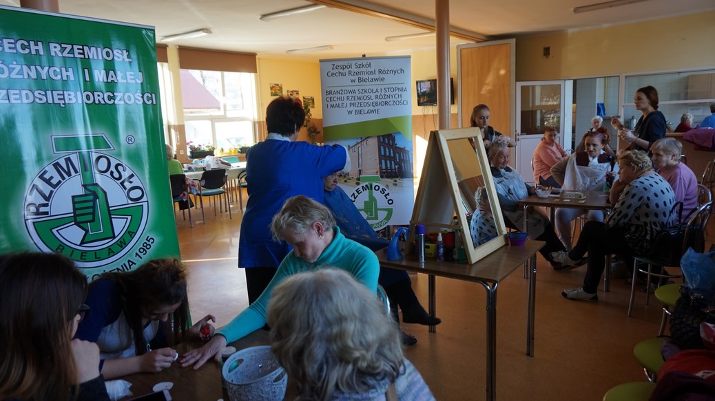 Uczennice szkoły w zawodach fryzjer – Wiktoria Zakrzewska i Dominika Kasprzak oraz Roksana Bobrowska i Natalia Siuty – uczące się w zawodzie sprzedawca, pod bacznym okiem doświadczonej fryzjerki p. Barbary Buczek z Zakładu Fryzjerskiego Damsko-Męskiego w Bielawie, doskonaląc swoje umiejętności praktyczne, z przyjemnością podcinały, modelowały, farbowały oraz czesały podopiecznych DDPS. Oprócz stanowisk fryzjerskich, odwiedzanych zarówno przez kobiety, jak i mężczyzn, dużym zainteresowaniem cieszyło się także stanowisko, na którym dziewczęta malowały paniom paznokcie. Było to drugie tego typu spotkanie z udziałem uczniów Zespołu Szkół Cechu Rzemiosł Różnych w Bielawie. Trzecie i ostatnie w tym roku odbędzie się w grudniu.